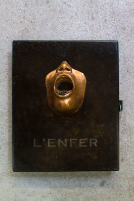 For his second, L’enfer, we developed a technique for transferring his erotic collages onto sandpaper, illustrating the painful aspect of love. A clandestine object, the book is presented in a metal case with a bronze sculpture incorporating a padlock.